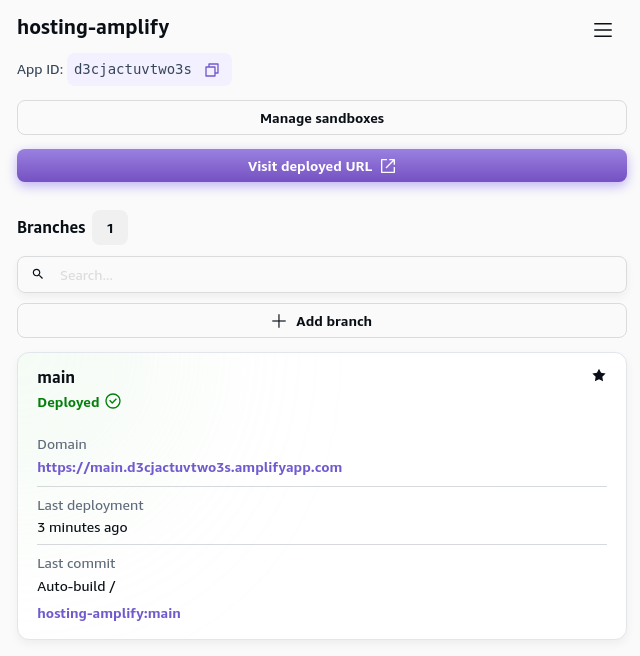 - 登录您的 AWS 账户,导航到 Amplify 控制台 ,然后按 部署应用程序 按钮。